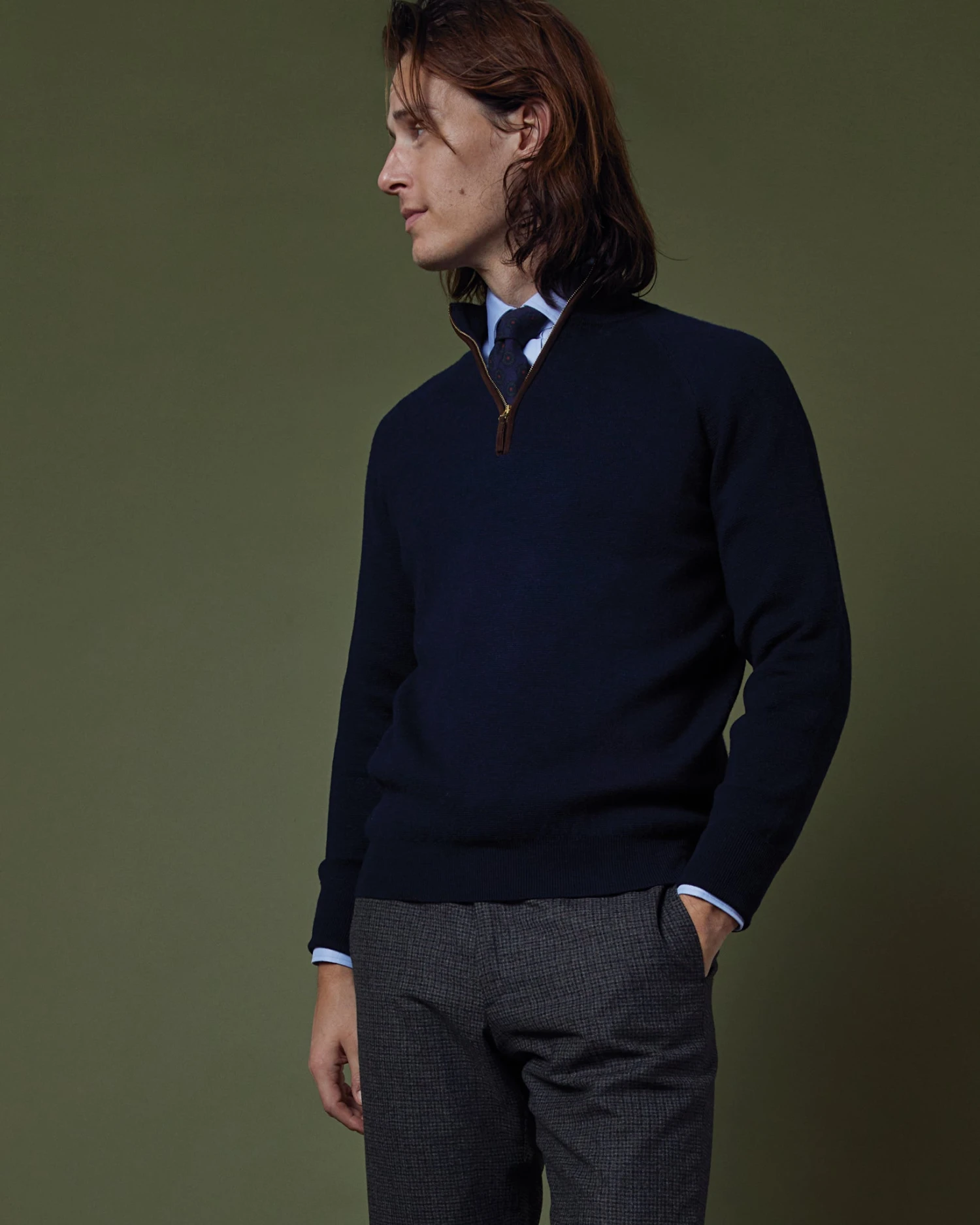 A half-zip sweater is a little sporty and a little retro… one of the best weekend sweaters we can think of. This one is made from milano-stitched, extra-fine Italian merino wool and plated with elastane. (That means that stretch yarn is actually knit into it, so it’ll hold its shape.) It’s finished with a suede-trimmed brass zipper that has a suede pull. Elevated without being fussy.