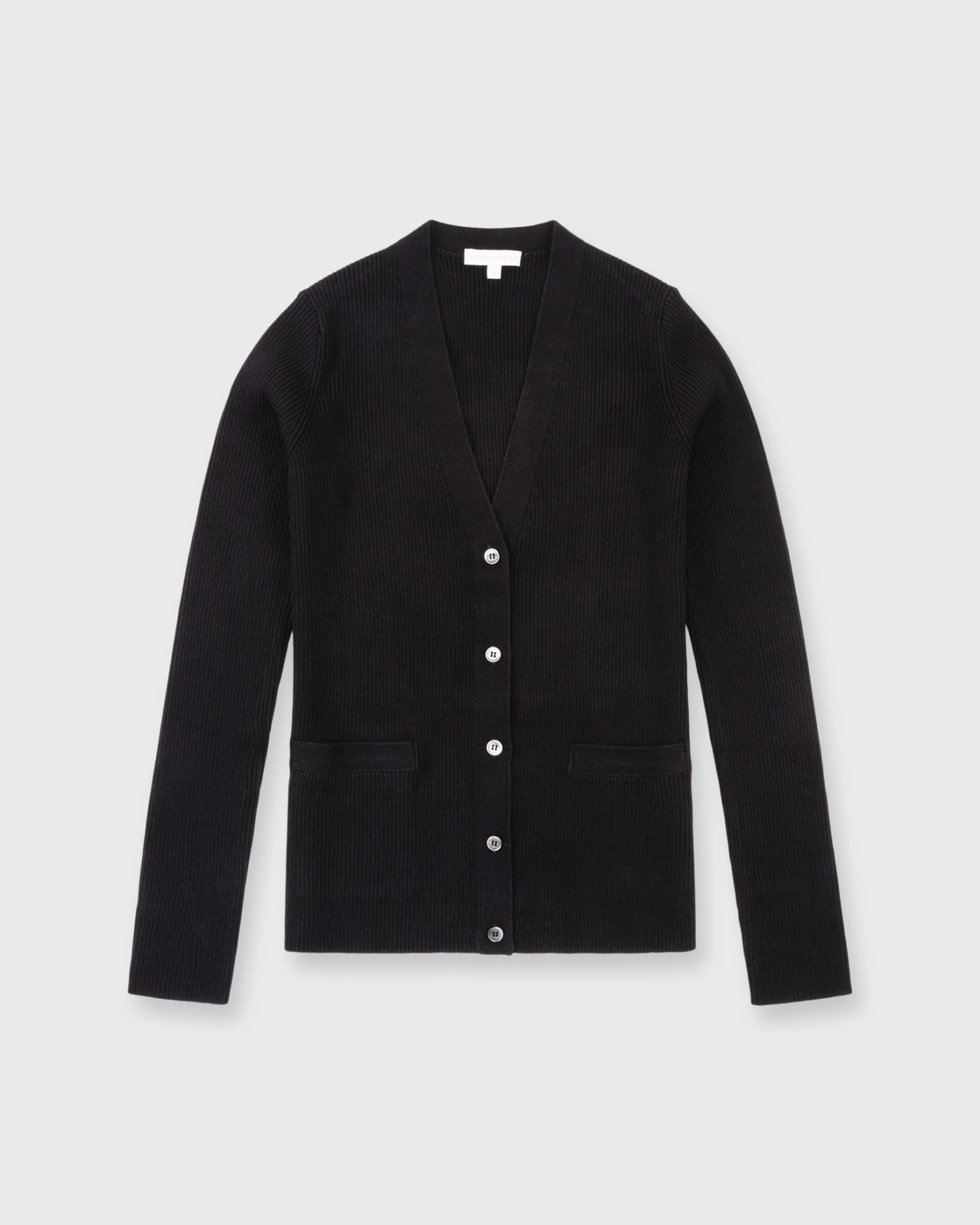 The ultimate dress-up cardigan. This one’s made of a sleek cotton blend with a bit of silk in the mix, so it’s refined enough for evening… but it’ll also elevate a t-shirt and jeans. It’s even great on its own— we love the way a cardigan looks worn as a shirt, and the V’s not too deep to pull that off. It’s got delicate shell buttons, front welt pockets, and a trim silhouette.